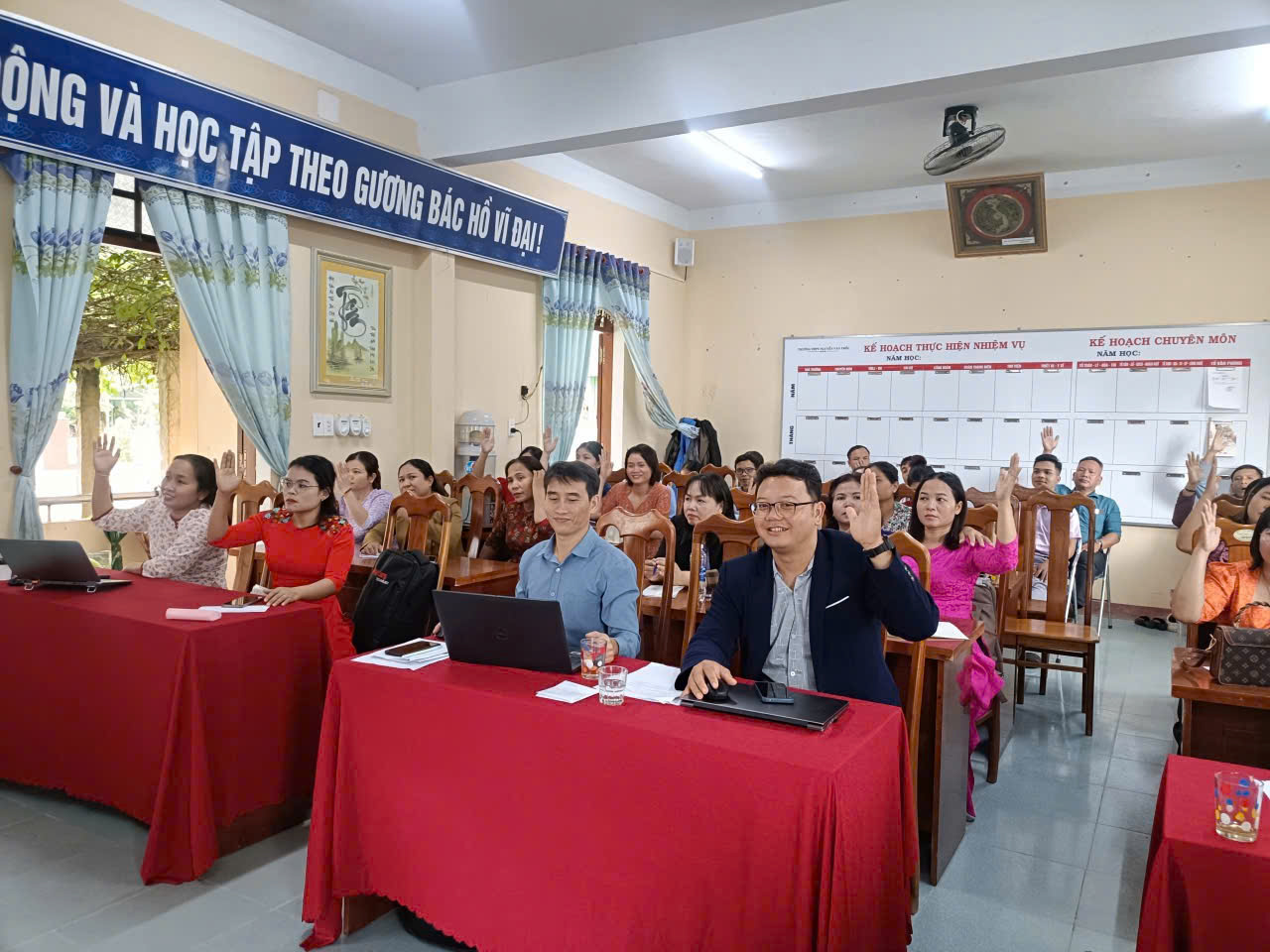 Hội nghị nghe Báo cáo hội nghị cấp tổ và thảo luận sôi nổi các dự thảo hội nghị, đặc biệt là kết quả thực hiện Nghị quyết Hội nghị Viên chức, Người lao động năm học 2024 – 2025 và phương hướng, nhiệm vụ – chỉ tiêu thi đua năm học 2025 – 2026.