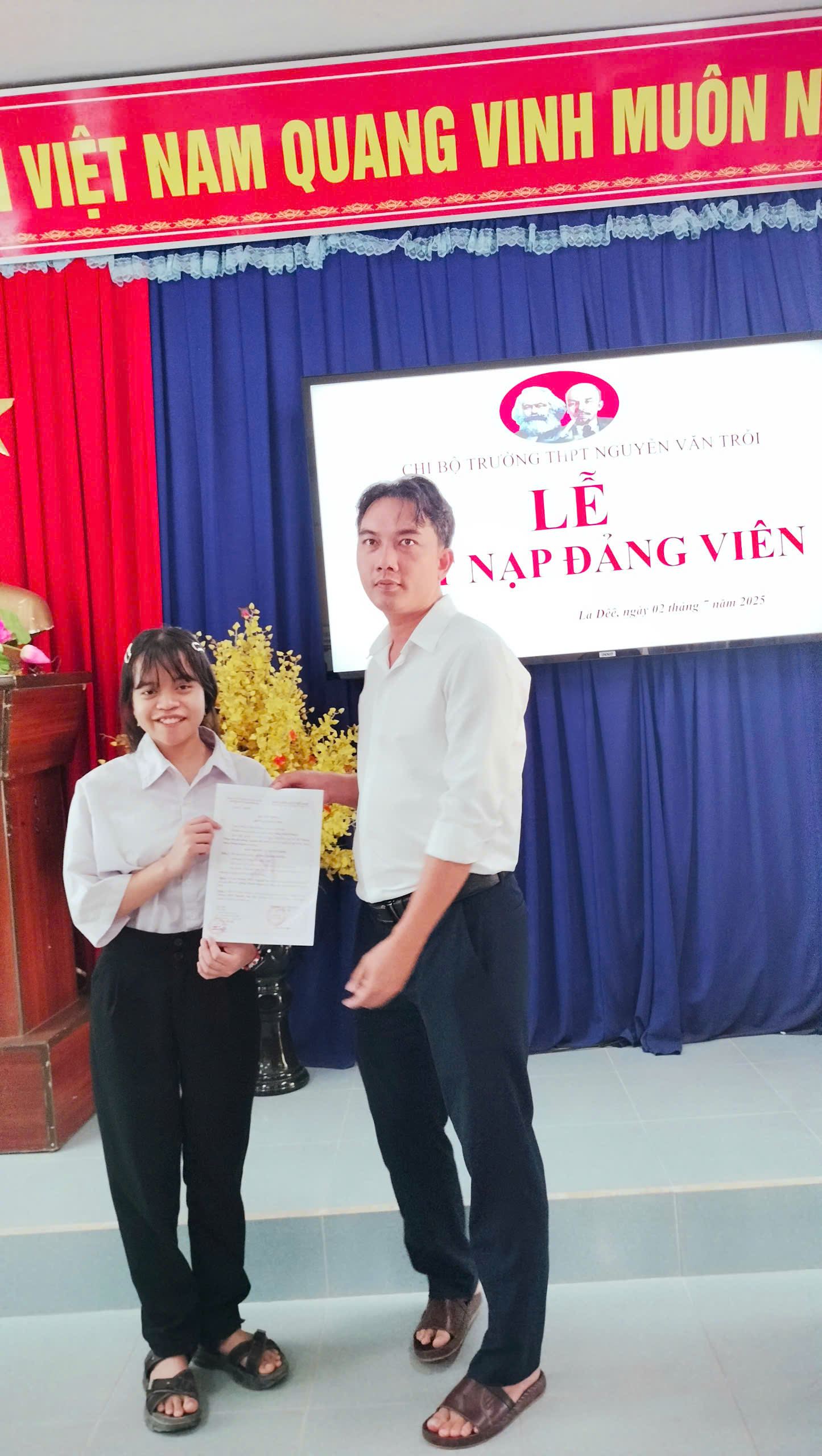 Sáng ngày 02 tháng 07 năm 2025, tại phòng Hội đồng Trường THPT Nguyễn Văn Trỗi, Chi bộ nhà trường đã long trọng tổ chức Lễ kết nạp Đảng viên mới cho 03 học sinh ưu tú của trường. Tham dự buổi lễ có đồng chí Bí thư Chi bộ, Ban Giám hiệu, đại diện các đoàn thể cùng toàn thể đảng viên chi bộ nhà trường.